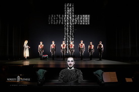 A következő hatáserősítő tényező: a többször csaknem tejesen csupasz színpad nem konkrét, hanem metafizikai teret jelenít meg, amelyben a díszletként használt tárgyak szimbolikus jelentésre tesznek szert. A csaknem végig színen lévő – hol tárolóeszközként, hol más célra használt – ládikaszerűség nem más, mint egy koporsó, a több jelenetben felbukkanó kereszt pedig olykor a vallás valamelyik irányzatának védelmében elesettekre, olykor az önkényuralom által meghurcoltakra utal. A színvilágot a fekete és a vörös határozza meg: az egyik az éjszaka, a halál, a gyász és a gonosz színe, a másik a tűzé, a véré, a tilalomé és a szexualitásé.
