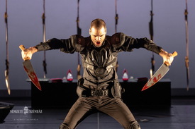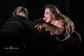 És hogy mivel várja a nézőket a Nemzeti Színház 2024. januári premierje, a Kurázsi mama és gyermekei, amelyet Theodorosz Terzopulosz vitt színre? Nos, hogy azzal kezdjük, ami a különféle feldolgozások befogadásában gyakorlott színházjárónak aligha okoz meglepetést: a görög rendező bizonyos helyeken átalakította az eredeti szöveget – egy gyors felsorolásban például mind a „Vidnyánszky”, mind a „Zelenszkij” név elhangzik Kurázsi mama szájából –, de a darab jelen verziója nem kíván ennél direktebb lenni, aktualizálás helyett inkább az eredeti általános üzenetét közvetíti, olyan eszközökkel, amelyek csaknem azonnal megragadják a néző figyelmét.