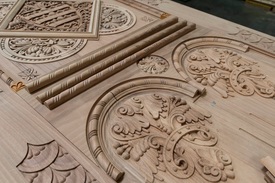 A Budavári Palota felújítás alatt álló Szent István-terme készülő egyik ajtószárnyának részlete a Pápai Asztalos Kft. üzemében Pápán 2021. május 11-én. Felújítják, restaurálják a Budavári Palota Szent István-termét, az asztalos munkák egy részét, az álmennyezet fa szerkezetét és az ajtókat a Pápai Asztalos Kft. készíti el