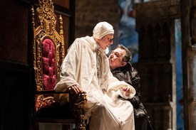 A komplex témafelvetés és a sűrített cselekmény miatt nem volt hát könnyű dolga az Újszínház alkotóinak. Még akkor sem, ha a rendezőnek felkért Nagy Viktor számára nem ismeretlen Herczeg világa: a szintén egy éles történelmi fordulópont, Konstantinápoly bukása idején játszódó Bizánc éppen két éve része a teátrum repertoárjának. Az élet kapuja most Fazekas István értő átdolgozása révén lett színpadképes mű, amelyben az értelmezést segítő betoldott monológok mellett sikerült megtartani a fő cselekményszálakat, és az alap írásnál talán jobban is kidomborítani a karakterek jellegzetességeit, néhol – Fiametta (Nemes Wanda), Gyula pápa (Viczián Ottó) – összetettségüket is. Csík György grandiózus és látványos díszletei révén szinte megelevenedik a regényben metafora, itt viszont nagyon is látható Szent Péter-bazilika bejárata és készülő freskói; a székesegyház épülése e felfogásban kétszeres szimbólum: az önhittségé és minden emberi lélek kifinomultságáé. A korrupt, pazarló Nyugatot saját fegyverével legyőzni próbáló, a pápai trónt hazája és Európa védelmére megszerezni akaró Bakócz Tamás (Dörner György) és II. Gyula harca azonban sajnos végig erőtlen marad: a néző ahelyett, hogy választhatna kettejük vélt vagy valós igazságai közt, készen kapja az azonosulási pontot. Természetesen Bakócz javára, aki az unokaöccsével – Vértesi Tamás szerepében Bánföldi Szilárd mintha a Csíksomlyói passió Jézusának szelídséget hozta volna magával ebbe az előadásba is – folytatott párbeszédek közben válik csak igazán érthetővé és elevenné. A magyarok „barbár szépségére” érzékenyen rávilágító énekes-mozgásszínházi betétek nagyon szép pillanatokat teremtenek a színpadon, ahogyan a magyar nép hosszú távú megmaradásának okait summázó zárójelenet is.