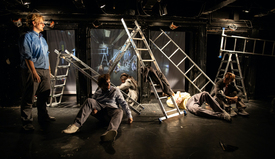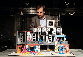 A színház stúdiójában látható előadás Simonyi-Lengyel Mira tervezte díszletei egyszerűek: néhány alumíniumból készült ipari létrán, egy gördíthető asztalon, az iskola makettjén és pár apró műanyag bábun túl hétköznapi használati tárgyak alkotják: festékesflakonok, hátizsák, pillepalack. És ahogy nő a feszültség, úgy válik mind rendezetlenebbé a színpadkép.
