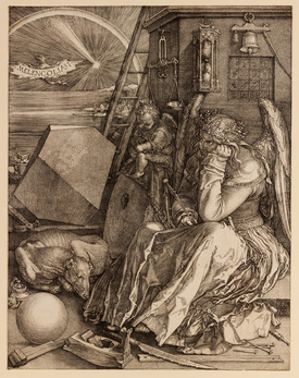 Közülük talán a Melencolia I. a legrejtélyesebb: különös tárgyaival egyszerre utal az asztrológiára, a geometriára, az építészetre, a kép címe ugyanakkor az ember lelki habitusát csoportosító elképzelésre utal. Míg azonban a középkori ábrázolásokon a melankolikus vérmérséklet többek közt a fekete epe túltengése miatt szerencsétlen típusnak számított, addig a firenzei újplatonisták Arisztotelész elképzelései nyomán némiképp rehabilitálták e kategóriát – az ókori gondolkodó szerint ugyanis a művészek és filozófusok mind e típusba tartoznak. Dürer e gondolatot követve az allegóriát a zseniális művészi alkat jellemvonásaként ábrázolta, annak minden esendőségével együtt.