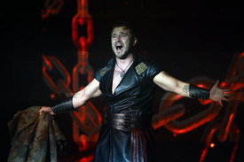 Ehelyett egy mozgatható platformon a magasba emelkedik, és a következő három dal – a Gyászba öltözött csillagom, a Töltsd el szívünk, fényesség, valamint a Hála néked, fejedelem! – alatt ott is marad, az égtől ugyan távol, ám egyértelműen a színpadon jelen lévők fölött.