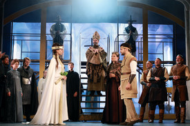 És hogy a rendezői koncepció után egyebekről is essék szó: Kárpáti Enikő hol vagány, hol ünnepélyes jelmezei a születőfélben lévő magyar királyság pompájára és gazdagságára emlékeztetnek. Bátonyi György díszletei a mobil elemek, valamint a vetített háttér kombinálásával teremtik meg egy kora középkori állam méltóságteljes, tekintélyt parancsoló épített környezetének illúzióját.