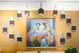Ma már persze senki nem gondolja így, ám a tárlaton egy igen érdekes elrendezés idézi meg a korabeli történetet: a vendégalkotóknak máskor is helyet adó, úgynevezett Tavasz terem fő falán Molnár-C. Pál Utolsó vacsoráját Aba-Nováknak a jászszentandrási templomhoz készített apostolfej-tanulmányai veszik körül. Ez előtt az úgynevezett szakrális fal előtt a négy művész istenkereső vallomásai olvashatók, illetve Derkovits egy kis reprodukciója látható.