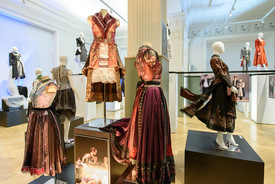 – Mindketten öt-öt darabban működtünk közre – veszi át a szót Furik Rita, aki a tárlaton kiállított munkáival két olyan előadást is megidéz, amelyben eredeti, tradicionális viseleteket állított össze, míg a többi jelmeznél az autentikus viseletek inkább ihlető forrásként szolgáltak számára. Úgy véli, mindez reflektál a táncegyüttes feladatára: a hagyományos táncanyagot bemutatni, emellett aktualizálni és a hagyományt új köntösbe öltöztetni egyformán lényeges.