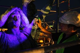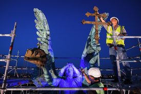 Több, mint 120 év után szükségessé vált Gábriel arkangyal szobrának a leemelése a Hősök terén álló monumentális millenniumi emlékmű korinthoszi oszlopáról. A közel 5 méter magas bronzszobor állapota drasztikusan leromlott, a korábbi felújítások során csak esztétikai beavatkozásokat végeztek el rajta, ezért felújítása elkerülhetetlennél vált. A munkálatok első és egyben leglátványosabb fázisában a vagyonkezelő Városliget Zrt. megvalósításában egy hatalmas állványrendszer épült a 36 méter magas oszlop köré, mely lehetővé tette a szobor aprólékos helyszíni felmérését, valamint előkészítését a leemelésre. A szobor „földre szállása” és restaurátor műhelybe szállítása sokszorosan összehangolt, mérnöki precizitást igényelt – mondta Gyorgyevics Benedek, a Városliget Zrt. vezérigazgatója.