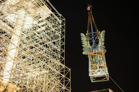 Érdekesség, hogy a szobrot több darabban emelték le az oszlopról, és még a magasban leválasztották Gábriel arkangyal kezéből a Szent Koronát és a kettős keresztet.