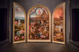 Hal hátán lovagló, repülő sellők, disznókon, lovakon és más négylábúakon nyargalászó meztelen férfiak, Vénusz tavában fürdőző bujálkodók, kagylóból nyújtózó karok és a legvadabb sci-fi látványvilágát is túlszárnyaló, hússzínű építmények, szuronyos fémgömbök: Bosch egyik legmonumentálisabb és legkülönösebb alkotása a Földi gyönyörök kertje triptichon. E művet még a Hertogenboschban, a mester szülővárosában rendezett 2016-os életmű-kiállításra sem adta kölcsön a madridi Museo Nacional del Prado, így a Szépművészeti tárlatán sem láthatjuk eredetiben: az egyik legkorábbi és legkvalitásosabb másolat képviseli a művet.