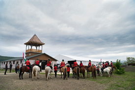 Lovasok a szlovák-magyar határtérségben 1,5 milliárd forintból megvalósult lovas és kerékpáros projekt átadásán a pomázi Magyar Vár Táborban 2024. április 23-án