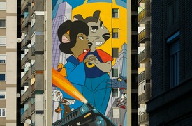 Újabb fővárosi tűzfalfestés készült el, ezúttal budapesti Szigony utcában; a több mint 400 liter színes falfesték felhasználásával és 2 hónapnyi munkával készült képen a Macskafogó című rajzfilm egér hőse, Grabowski látható.