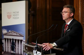 Hankó Balázs kulturális és innovációs miniszter beszédet mond a Fejedelmek aranya című kiállítás sajtótájékoztatóján a Magyar Nemzeti Múzeumban 2025. március 13-án