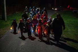 Saját készítésû lámpásokkal vonulnak gyerekek a Kolozs megyei Ajtonban szervezett hagyományos Márton-napi felvonuláson 2024. november 9-én.