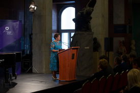 Závogyán Magdolna, a Kulturális és Innovációs Minisztérium kultúráért felelős államtitkára beszédet mond a Liszt Ünnep programsorozatot megnyitó ünnepségen a Magyar Nemzeti Galériában 2024. október 9-én