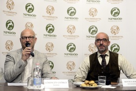 Kovács Zoltán, a 2021-es „Egy a Természettel” Vadászati és Természeti Világkiállítás lebonyolításáért felelős kormánybiztos (j) és Lőrinczy György kurátor sajtótájékoztatót tart a Vadászat és vadászfegyverek Magyarországon című kiállítás megnyitója előtt a Magyar Mezőgazdasági Múzeumban 2021. augusztus 24-én