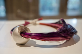 A kísérletezés egyik nagymestere Gera Noémi, akinek ékszerei éppen ezért mindig színesek, játékosak, sőt általában változtathatóak is. A Ráth-villában látható, szalagszerű Teljesítmény nyaklánca (Power Necklace) a biztos, hogy semmi sem biztos élményét dolgozza fel, az adott pillanatban született döntéseink esetlegességét, azt, hogy a tudatküszöb alá szorult hagyományok, a felnőttkori szabályok és kapcsolataink hogyan határozzák meg sorsunkat, alkotásainkat. Miközben persze semmi sem történik véletlenül, fontos, hogy az állandó kötöttségek mellett legyen lehetőségünk a változásra. E gondolat jelenik meg nyakláncában is, amelynek a sodronyszálai rugalmasak, a kötéstechnika pedig lehetővé teszi a mozgásukat: a forma változik, a tárgy ugyanaz marad.