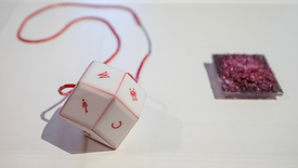 Vékony Fanni szintén a szabadságot és a kísérletezést szereti az ékszertervezésben, miközben egyik kedvenc anyaga az inkább az állandóságot sugalló corian. A Magyarországon talán kevéssé ismert, de számos jó tulajdonsággal bíró, így kopás-, tűz- és saválló, színtartó, hosszú élettartamú „szuperanyagot” elsősorban a konyhabútorgyártásban használják, de Vékony Fanni már az első pillanatban tudta, hogy kellemes tapintása miatt jó alapanyaga lehet ékszereknek is. A tárlaton is egy corianból készített darabbal, Az ördög csontjaival (The Devil’s bones) mutatkozik be. A dobókockára hajazó medál az emberi életet véve alapegységként, véletlenszerűen határozza meg a dolgok súlyát – ez az alkotó elgondolása szerint mindenkinek mást jelent, a dolgok értéke ugyanis relatív. A kocka emellett figyelmeztetés is mindazok számára, akik az emberi élettel játszanak, kockára teszik.