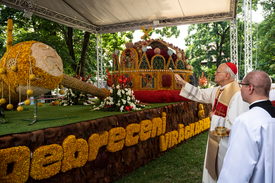 Erdõ Péter bíboros, esztergom-budapesti érsek megáldja a Debreceni Virágkarnevál Szent Koronát ábrázoló virágkocsiját az esztergomi bazilika mellett a Nagyboldogasszony ünnepén bemutatott mise után, 2021. augusztus 15-én.