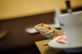 Bezzeg Budapesten! Az ötödik kerületben található Zoo Caféban gyakorlatilag egy fél állatkert működik, csupa nagy szeretettel, kicsi korától kézre nevelt állat. Biztonsággal megfoghatjuk őket, barátságosak, mérsékelten érdeklődőek: számukra itt minden ismerős. Csak egy kis nyuszi volt nagyon kíváncsi, kimondottan érdekelte a többi állat az asztalon, a kávénk is, legszívesebben mindenbe beleütötte volna az orrát. Kaptunk egy párduckaméleont is, vele kapcsolatban arra kell ügyelni, hogy a kezünkkel folyamatosan mászófelületet biztosítsunk a számára, mivel nem tesz jót a lábainak a sík terep. Egy kakadu is telepedett a vállunkra, már elég jól beszél, megkérdezte tőlünk: hogy vagy? Majd közönyös hangon hozzáfűzte: szép vagy. Aztán egy nehezebb vendégállat következett: az országban az egyetlen fehér színű afrikai királypiton, de finoman ráhajtotta a fejét a karunkra, inkább csak az volt nehéz, hogy megtartsuk az egész testét, mert egyes részei összevissza lelógtak, attól tartottunk, leesik.