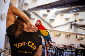 – A párommal mindketten a vendéglátásban dolgozunk, én vidéken nőttem fel, ahol számomra természetes volt az állatok közelsége. Szerettem volna a kettőt összehozni – meséli a kezdetekről Karalyos Réka, a Zoo Café ügyvezetője. – Nem volt könnyű, számos önkormányzatnál elutasítottak, de itt, a főváros szívében, ahol a családok számára egyre inkább leszűkültek az állattartás lehetőségei, igent mondtak az ötletre. Kilenc hónapig tartott, mire megnyithattunk, az állatokat az állatkerti rendelet szerint tartjuk, a jogszabályokat túl is teljesítjük, a pincérek mellett mindig van legalább egy-két, de inkább négy-öt állatgondozó is a kávézóban.
