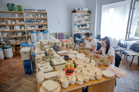 – Az eddigi legnehezebb feladatunk az év eleji műkorcsolya és jégtánc junior vb-re megrendelt dísztálak elkészítése volt: ketten 1200 darabot készítettünk el két hét alatt – meséli Ugrainé Fehérvári Zsani, a műhely vezetője. Három gyermeket nevel. Korábban a helyi postán dolgozott, ám a postabezárások után nem akadt munka a faluban, így nagyon boldog volt, amikor felajánlották neki az állást a kerámiaműhelyben. Lakatos Fanni Sátoraljaújhelyen végezte a középiskolát, aztán megszületett a kislánya, később pedig csak a helyi önkormányzatnál dolgozhatott közfoglalkoztatásban konyhai kisegítőként. Innen hatalmas előrelépés számára a kerámiaműhely. És nemcsak a biztos megélhetés miatt, hanem azért is, mert kreativitását és kézügyességét is próbára teheti.