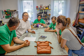– Eleinte bárányos logóval készítettünk öveket. Imivel egyszer kiszámoltuk, egy év alatt csaknem kétezer-ötszáz darab került ki a kezeink közül. Szakmámra nézve bőrdíszműves vagyok, emellett diakónus és szociális munkás is, szabadidőmben pedig méhészkedéssel is foglalkozom – mondja Szabó Zoltán, és mesél az általuk készített termékekről is. Pankotai Csaba tervei nyomán a több színben kapható bőrtáskák origamitechnikával készülnek, amihez csak minimális varrás szükséges – a nehéz és vastag marhabőrrel ugyanis nem könnyű dolgozni. Az origamitechnika megkönnyíti a munkát: a táskákhoz szükséges anyagdarabokat sablon segítségével vágják ki, majd hajtogatják és bőrszalaggal fonják össze őket. A bőrtárcák és tolltartók mellett kulcstartók és más apróságok is készülnek, például Ani ügyességének köszönhetően a puhább kecskebőr maradékaiból fülbevalók, a kemény marhabőr resztlijéből pedig fonott vagy szegeccsel rögzített csinos bőr karkötők.