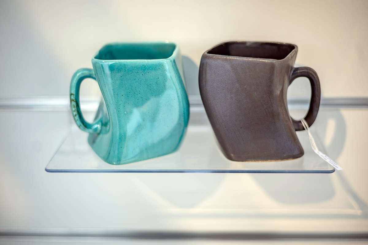 Közben átsétálunk a szomszédos kerámiaműhelybe. Középen hatalmas asztal terpeszkedik, tele zsengélésre, vagyis kiégetésre váró, készre munkált tárgyakkal. A fal mellett a jókora kemence, épp hűl. Több tucat bögre ücsörög a nemrég még 1200 fokos kemencetérben: égszínkék, lazacszín és irizáló türkiz – mindegyik effektmázas, ami égetés után izgalmas, szétfolyó mintákat eredményez majd. Öntött és nyújtott technológiával készülnek itt a tárgyak, amihez fizikai erő és persze kézügyesség is szükségeltetik. Lakatos Fanni és Ugrainé Fehérvári Zsani, a két fiatal édesanya napi nyolc órában végzi ezt a munkát.