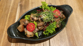 A déli, illetve esti ételkínálat összefogott, lényegre törő: „barfood” a marhapofától a BBQ-oldalason át a székely káposztáig, bowlok és tapasok a fokhagymás-chilis ráktól a sült kecskesajtig. Ebből a sorból kértünk rosé kacsamellet gyömbéres körtével, ami salátaágyon érkezett, és kitűnőnek bizonyult, valamint vegyes gombát vaslapon sütve, amihez nagy örömünkre kevertek vargányát is. Ráadásul itt tisztes előételadagot adnak baráti áron a tapas műfajában, nem szimbolikus kóstolómennyiséget. A Káli Kövek pincészet Olaszrizlingjét valamint a Kreinbacher pince Juhfarkját ittuk hozzá, de nem tudtunk ellenállni a csapolt Távoli Galaxisnak sem. Sörben, borban, ételekben is egyediség, személyesség, minőség – ezt nyújtja a Bartók, valóban reggel, délben és este is.