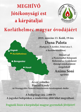 A kárpátaljai Korláthelmec magyar óvodájának megépítéséért szervez jótékonysági estet a Magyar Patrióták Közössége. Az Ungvár közelében fekvő, nagyobbrészt ukrán települések által közrefogott magyar falu afféle végvár, így stratégiai jelentőségű az intézmény létrehozása. A hazafias civil szervezet ezért 2018. március 13-án, kedden 19 órára a fővárosi Duna Palotába (1051 Budapest, Zrínyi utca 5.) hívja és várja mindazokat, akik szívükön viselik a kárpátaljai magyarság sorsát. Az esten műsort ad a Pesterzsébet Központi Református Gyülekezet ifjúsági zenekaraként létrejött Anima Soni együttes.