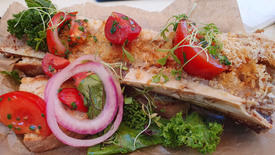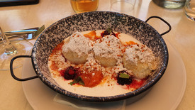 A beltér hangulatos, hűs, de mi inkább kint ültünk a csodás lugasban. A kiszolgálás udvarias, szakszerű, az árak ugyan nem alacsonyak, de értékarányosak. Ettünk kiváló hideg málnalevest, házias, intenzív ízű húslevest, pazarul feltálalt, ízre-állagra-hőmérsékletre egyaránt kifogástalan velős csontot, tanyasi csirkemellet kreatív és bátor körettel (grillezett sárgadinnye és padlizsán, hirtelen megfonnyasztott erdei gyümölcsök és izgalmas salátalevelek), parmentier-t kacsacombból (a séf újítása egy francia klasszikus átírásával), pirított kecskesajtot kiválóan elkészített céklával és körtével, valamint könnyed, remek tejfelmártással és gyümölcsökkel körített túrógombócot. Pazar élmény volt a Pántlika Porta, egyike a legjobbaknak az északi parton.