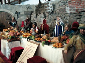 „A vár egyik termében egy 22 lépés hosszú, keresztben felállított asztalhoz ültek, amely három gyönyörű piros bársony­ takaróval volt lefedve. (…) Az első fogás édesség volt. A második fogáson és fogásban élő madarak énekeltek. A harmadik fogás fekete vadpecsenye, a negyedik vagdalt hús fehér és barna szeletekben, az ötödik egy aranyozott puszpángbokor utánzata, amelyen csillogó angyalok és mókusok pihentek. A hatodik tálban gyöngytyúkok és kappanok sárga almákon álltak. A hetedik egy kertet ábrázolt. Kerítésén madarak ültek, a kert közepén arany mirtuszfa emel­kedett. Ezen akkora barna és zöld körték és sütemények függtek, mint egy kókuszdió. Az egész pörköltcukorból készült. A nyolcadik fogás rizs, a kilencedik ismét vadpecsenye, a tizedik csirkebecsinált valamilyen sárga mártással, végül a tizenegyedik kitolófánk volt.”