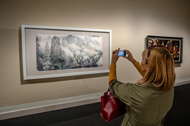 – A hagyományos kínai festészet alapvetően három típusú képet ismer, amiből kettő tájkép. Az első lényege az ember és a természet harmóniájának bemutatása, amelynek fő eleme a hegy és a víz. Ugyanakkor ez a kép soha nem valós tájat jelenít meg, csupán azt az impressziót vagy emléket, amit a látvány az alkotóból kivált. A tájban emellett szerepelnie kell valamilyen emberalaknak, de ha mégsem, akkor lennie kell rajta valamilyen ember alkotta tárgynak, általában pagodának vagy pavilonnak – mesél a hagyományos kínai festészet alaptípusairól a kurátor. – Az emberek megjelenítésén túl a harmadik típus az állatok és a növények ábrázolása, ilyenkor jellemzően madarakat – mandarinkacsát, a hosszú életet szimbolizáló darvat, illetve a császárt vagy a császárnét jelképező főnixet – és a hosszú életet, a gazdagságot jelentő szilvafát, fenyőt és bambuszt festenek a képekre.