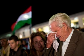 Egy férfi könnyeit törli, amint a csíksomlyói búcsúra tartó Boldogasszony Zarándokvonat Gyergyószentmiklósra érkezik.