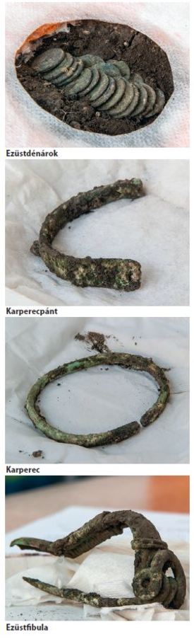 – Mester Péter régész vezetésével feltártunk egy késpengét és egy, a férfi lábára helyezett vörösre égetett korongolt tálat. Nagy meglepetésünkre egy erszényben 18 darab ezüstdénárt találtunk, és szólóban is egyet. Az érmékről egyelőre nem tudjuk megmondani, hogy mikor verték azokat, hiszen még nincsenek restaurálva, oxidréteg van rajtuk, így nem látszik sem a császárportré, sem az érme felirata. Találtunk kevésbé jellegzetes ezüst karpereceket és hajkarikát, amelyekhez hasonlókat évszázadokon át használtak a szarmaták, és más népcsoportok is. A régészek által feltárt ezüstfibula, vagyis ruhakapcsoló tű azonban már beszédesebb lelet, nagy valószínűséggel a III. század végén, IV. század elején gyártották. Ez az időszak lehet a temetkezés kora is. Amint rendelkezésre állnak a természettudományos, a tipológiai és a numizmatikai elemzések eredményei, reményeink szerint ennél pontosabban is meg tudjuk majd határozni a temetkezés idejét. Egy biztos: olyan családi sírra bukkantunk, amelynek tagjai jómódban élhettek.