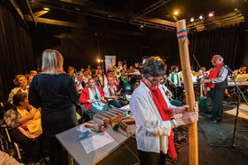 Ha nem látnánk, csupán hallanánk a dalokat, azt gondolhatnánk, hivatásos muzsikusok játszanak. Az természetesen érzékelhető, hogy nem a Zeneakadémia végzősei koncerteznek, relatíve egyszerű tételek váltják egymást, ám a nagy létszámú társulat hangzása egységes, a hangok pontosan követik egymást. Legyinthetnénk, hogy mindez el is várható egy élő produkcióktól, de minden más megvilágításba kerül, ha tudatosítjuk magunkban, hogy itt, néhány segítőt leszámítva, közepesen vagy súlyosan értelmi fogyatékos fiatal és középkorú emberek méretik meg magukat a nagyközönség előtt.