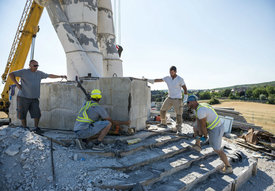 Betonszarkofág eltávolított darabjai az épülő Miskahuszár szobránál. Fotó: MTI/Bodnár Boglárka