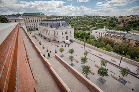 Miután egy kicsit megpihenünk a Török kert padjain, megkerüljük a Lovardát, amelynek eredeti formájában újraalkotott, vörös és zöld angol palával fedett tetőszerkezete tavaly megnyerte a Nemzetközi Tetőfedő Szövetség németországi világbajnokságát. Majd az eredetileg „lovak le- és felvezetésére szolgáló lejtős úton”, vagyis az újjáépített és az év elején átadott Hauszmann-féle rámpán egy kényelmes gyaloglással hamar felérünk a palotaszintre.