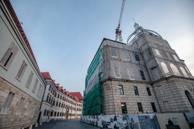 Szembetűnő a változás az egykori Honvéd Főparancsnokság épületében is. A márciusban elkezdett rekonstrukció egyik leglátványosabb elemeként néhány héttel ezelőtt helyére került az a kupolaszerkezet, ami a tervek szerint a Budavári Palotanegyed jövőbeni látogatóközpontjának kilátójaként működik majd.