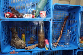 A kiállítás minden eleme az újrahasználat és az újrahasznosítás jegyében jött létre. A bemutató alapját adó használt komp és a tengeri konténerek alkotta térben több tonna folyami és szelektív hulladékból készült el a bemutató. Az orr és a tat burkolatának nyersanyaga folyami műanyag, az asztal és a regisztrációs pult uszadékfából készült, a felső fedélzet burkolata lakossági szelektív gyűjtésből származik. Az ablakok, ajtók, szigetelőelemek kivétel nélkül egyedi felajánlásokból, lakásfelújításokból, építkezésekből származnak. A sokféle nyersanyagot a petkalózok építették be a kiállításba.