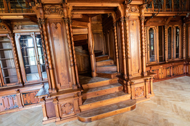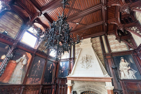 A kor egyik legmodernebb kastélyának Hauszmann Alajos tervezte belső tereiben és szobáiban minden az elvesztett hitvesre emlékeztetett. Az ebédlő falaira Zichy Ilona ízlése szerinti gyümölcsös és madaras csendéletek kerültek, a dolgozószobát Barabás Miklós két, az asszonyról festett képe díszítette. A szerelmét soha nem feledő grófnak ráadásként még a pápai engedélyt is sikerült beszereznie a Vatikánból, hogy a család házi festője, Valentiny János a falubeli Szent Ilona-templom főoltárán Zichy Ilona vonásait örökíthesse meg. Nádasdy Ferenc családjához való ragaszkodását jól mutatja Magyarország kastélyépítészetének egyik legszebb terme, az Ősök csarnoka is. Ennek falait a Nádasdy-ősökről készült életnagyságú olajfestmények díszítették, köztük persze a fő helyre, a monumentális márványkandalló két oldalára került Benczúr Gyulának a házaspárról festett portréja. A különleges vörösfenyő faburkolat Thék Endre asztalosműhelyében készült, akárcsak a könyvtárszobáé, amelynek galériás polcrendszerét egykor több mint huszonötezer kötet töltötte meg. A már restaurált könyvszekrények egyelőre még üresek ugyan, de nemrégiben számos darabot sikerült a Nádasdy-könyvtárból azonosítani, ezek hamarosan vissza is kerülnek eredeti helyükre. Csakúgy, mint az Ősök csarnoka festményeinek döntő többsége, amelyeket a második világháború előtt befalaztak, így sikerült őket 1945 után épségben a Nemzeti Múzeumba menekíteni.