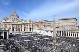 Ferenc pápa virágvasárnapi szentmiséjén vesznek részt hívek a vatikáni Szent Péter téren 2023. április 2-án.