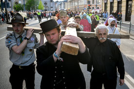 Keresztet visznek vállukon férfiak a virágvasárnapi barkaszentelés után tartott bibliai keresztúton a debreceni Széchenyi utcán 2019. április 14-én.