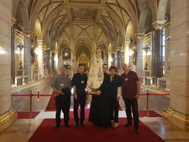 „A zarándokok ezután találkoztak a délvidéki – jelenleg Bécsben élő – Pusztay Csabával, aki megszervezte, hogy a bécsi Fatimai Szűzanya csoport, amely a Szűzanya szobrát körbeviszi a világban, eljöjjön Budapestre május elsején, és meglátogassa a Szent Koronát. Sikerült is megszerveznünk a látogatást az Országházban” – tudtuk meg Wittner Máriától, aki azt is elmondta, hatalmas élmény volt, amikor a Fatimai Szűzanya szobra belépett a Parlamentbe, a látogatók odasereglettek, sokan letérdeltek és hangosan imádkoztak. Volt, aki könnyezett.