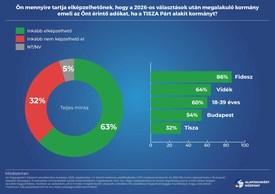 Az Alapjogokért Központ felmérése szerint a szavazókorú magyarok 63 százaléka úgy véli, a 2026-os választások után a Tisza Párt megemeli az adókat. Mindössze a megkérdezettek 32 százaléka hisz Magyar Péternek, aki a botrány kirobbanása óta „lehetetlenebbnél lehetetlenebb tervekről beszél”, miközben a hozzá közelálló baloldali szakértők a progresszív adózást támogatják.