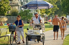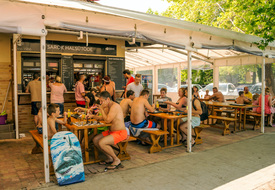 Keszthely, Városi Strand. Megkérdezzük, be tudnánk-e menni jegyváltás nélkül, nem strandolni akarunk, hanem az árakat fotóznánk és a szolgáltatókkal beszélgetnénk. A beengedést ellenőrző, szemmel láthatóan diákmunkás fiatal lány azt mondja, este hét után már nem fizetős a strand, és a vendéglátóhelyek még hosszú órákon keresztül nyitva vannak. Megköszönjük a jó tanácsot, igaz, miért is zárnának be, a városból még sokan lejönnek vacsorázni, inni valamit. Addig is megnézzük a keszthelyi Pavilon-sor felhozatalát.