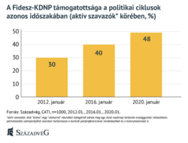 A Századvég friss elemzése szerint azonban – e tendencia ellenére – a Fidesz-KDNP támogatottsága erősebbé vált az egyes kormányciklusok félidején. A politikailag aktív választók körében a három releváns politikai ciklus azonos időszakait összevetve a jelenlegi ciklusban a legmagasabb a kormánypártok támogatottsága: míg 2012 januárjában az aktív (választáson részt venni szándékozó) szavazók 30 és 2016 szóban forgó időszakában a 40 százaléka, addig idén januárban a 48 százalékuk támogatta a Fidesz-KDNP szövetséget.