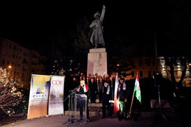 A Bem-szobornál a résztvevők magyar és lengyel zászlókkal, valamint fáklyák meggyújtásával is kifejezték szolidaritásukat a keresztény-nemzeti-konzervatív lengyel „bajtársakkal”.