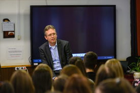 Hankó Balázs helyettes államtitkár előadást tart az átalakított felsőoktatásról a székesfehérvári Tóparti Gimnázium és Művészeti Szakgimnázium végzős diákjainak 2021. december 10-én