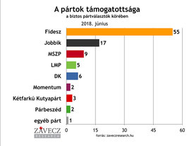 A Fidesz továbbra is maga mögött tudhatja a választókorú népesség egyharmadát, akárcsak a múlt hónapban. A Jobbik támogatókat veszített: májusban 15 százalékon állt, most 13 százalék támogatja. Az MSZP-re a teljes népességen belül 6 százalék voksolna, a Párbeszédre 1 százalék, a múltkor együttesen 7 százalékuk volt. A DK tábora szokásos módon stabil, ezúttal is 4 százalékos. Az LMP-nek májusban 4, most 3 százaléknyi szavazót sikerült felsorakoztatnia. A Kétfarkú Kutyapártot a lakosság 2, a Momentumot 1 százaléka támogatja.