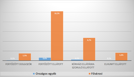 Farkas Örs a bejegyzéshez megosztott egy grafikont is az idősotthonok járványügyi adatairól. A kategóriák teljes létszámához viszonyító grafikon szerint a fertőzött dolgozók száma a fővárosban 1,5 százalék, országosan 0,1 százalék, a fertőzött ellátottak száma a fővárosban 10,2 százalék, országosan 0,6 százalék. A kórházi ellátásra szoruló ellátottak száma a fővárosban 4,7 százalék, országosan 0,2 százalék, míg az elhunyt ellátottak száma a fővárosban 1,6 százalék, országosan 0,1 százalék.